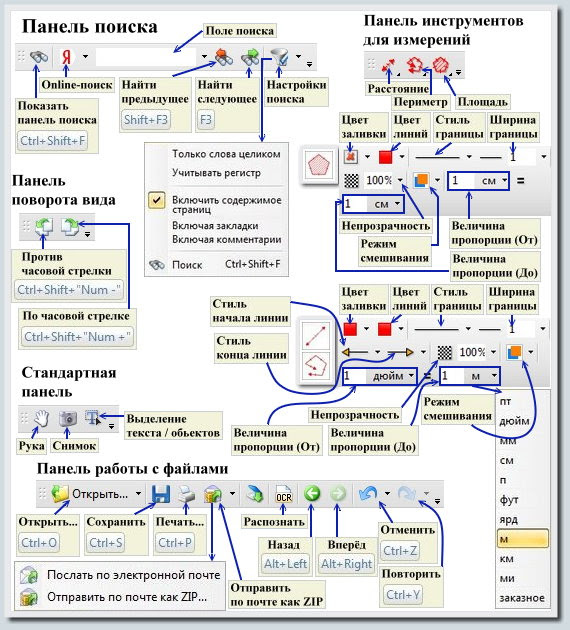 Панель поиска, Панель инструментов для измерений, Стандартная панель и Панель работы с файлами